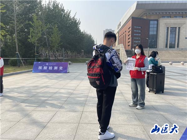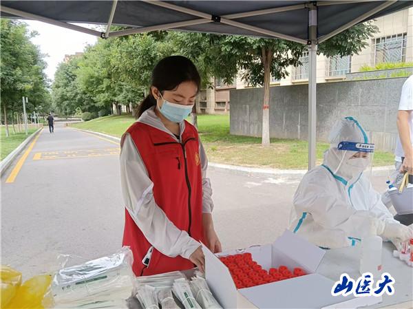 与她们一样,中都、迎泽两校区的410名志愿者们在那一天,怀揣着对志愿者使命的共同追求,坚定地投入到这场并不简单的迎新活动中去。他们来自不同专业、不同年级,根据需要分成了行李转运组、就餐保障组和核酸检测组。在迎接新生的两天内,从早上七点到晚上十点,他们承担起查验防疫健康码,协助核酸采样、帮助新生搬运行李和协助食堂工作人员静默管理期间盒饭打包等多项工作。