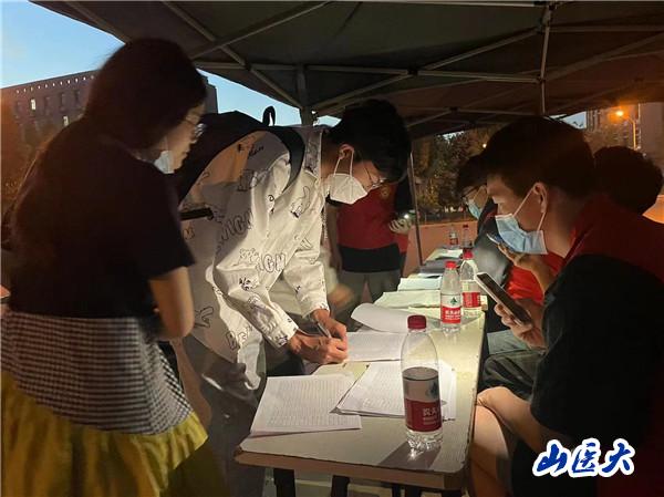 相比于白天的骄阳似火,晚上的山医校园气温骤降。药学院2021级志愿者张瀚文也感触颇深,“看着新同学们,踏着夕阳与繁星,急匆匆地赶来做核酸,感觉到新鲜的血液正源源不断地注入医科大。”