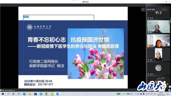 为了增强新冠疫情下医学生的责任与担当,维护学生身心健康,强化大学生价值引领。11月22日晚,迎泽校区教学办公楼网格区线上开展了 “青春不忘初心志、抗疫报国济世情——疫情下医学生的责任与担当”专题思政课。讲座由二级网格长、麻醉学院副书记杨洁主讲。网格区三级网格长张晓林、闫丹凤、王婕、范静,四级楼层网格长、五级宿舍网格长及部分网格内学生共279人参加了专题思政课。