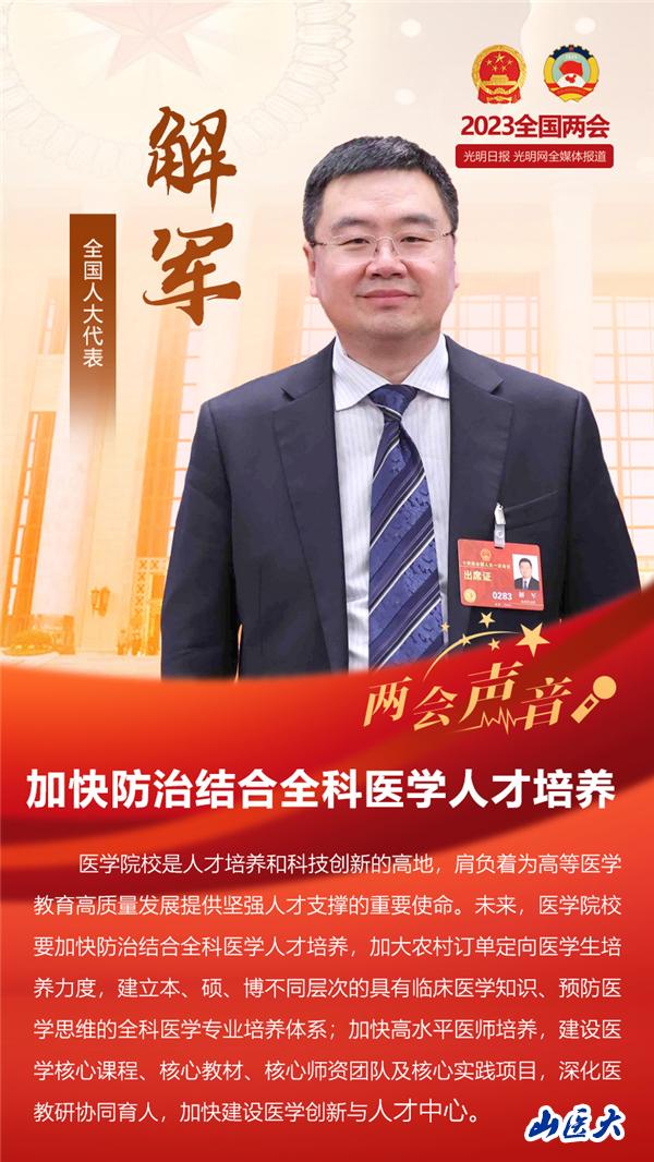 解军在采访中表示,医学院校是人才培养和科技创新的高地,肩负着为高等医学教育高质量发展提供坚强人才支撑的重要使命。未来,医学院校要加快防治结合全科医学人才培养,加大农村订单定向医学生培养力度,建立本、硕、博不同层次的具有临床医学知识、预防医学思维的全科医学专业培养体系;加快高水平医师培养,建设医学核心课程、核心教材、核心师资团队及核心实践项目,深化医教研协同育人,加快建设医学创新与人才中心。