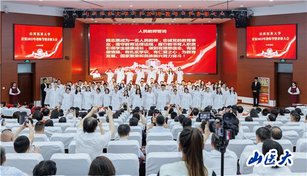 为了增强职业荣誉感、历史使命感和社会责任感,在庆祝大会上,校党委副书记王宏伟领誓,90多名新进教师代表庄严宣誓。