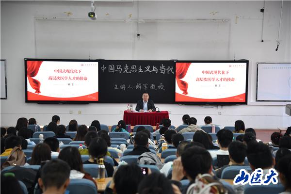 为深入贯彻落实习近平总书记关于思政课建设的重要指示精神,贯彻落实党的教育方针和立德树人根本任务,进一步强化学校党政领导抓思政课建设的主体责任,10月11日上午,校长解军走上讲台,以“中国式现代化下高层次医学人才的使命”为题,为我校2023级210名博士研究生带去了一堂立意高远、启智润心、激扬斗志的思想政治理论课。《中国马克思主义与当代》课程负责人王志中教授主持活动。