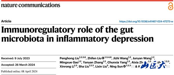 近日,我校精神卫生学系张克让教授团队在Nature子刊Nature Communications杂志上发表题为“Immunoregulatory role of the gut microbiota in inflammatory depression”的论文。首次揭示了炎性抑郁症患者的肠道菌群特征及其免疫调控机制。刘鹏鸿副教授和刘志芬主任医师为本文共同第一作者,张克让教授和孙宁副教授为本文共同通讯作者。