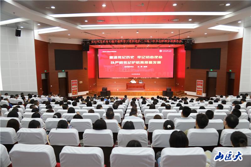 9月3日下午,我校在中都校区教学办公楼报告厅举办党纪学习教育专题党课。校党委书记王军以《重温党纪历史 牢记初心使命 以严明党纪护航高质量发展》为题,为全校党员、干部、师生授课。校党委副书记彭月兰主持会议。全体校领导,全校处级以上干部、第一医院、第二医院班子成员,机关全体科级干部、驻校纪检监察组全体干部,思政课教师、思政辅导员、专职组织员、分团委书记、学生党员代表等参加会议。