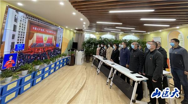 在迎泽校区,后勤保障处党总支第三、第四党支部党员在我校幼儿园一层多功能厅收看了大会开幕会,其他各支部的党员以分散自主的形式收看了大会盛况。