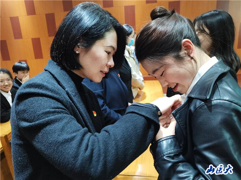 活动在庄严的国歌声中拉开序幕,赵子瑞宣读了2023年度新发展党员名单。全体党员在领誓人姜敏的带领下高举右手,庄严宣誓。宣誓结束,老师们为2023年度新发展党员佩戴党员党徽。