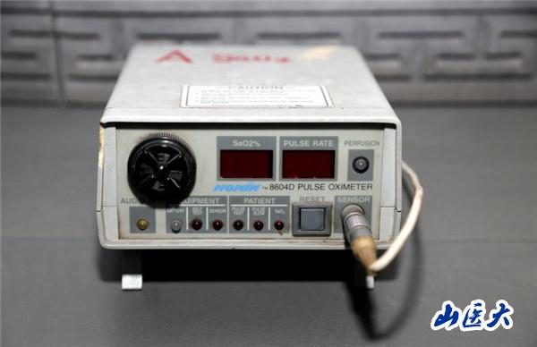 物品说明:血氧饱和度监测仪是通过检测充血人体末梢组织,如手指或耳垂等部位,对不同波长的红光和红外光的吸光度变化率之比(R/IR值)推算出组织的动脉血氧饱和度(SaO2)。(由第一医院麻醉科吕洁萍、张艳鹏提供)