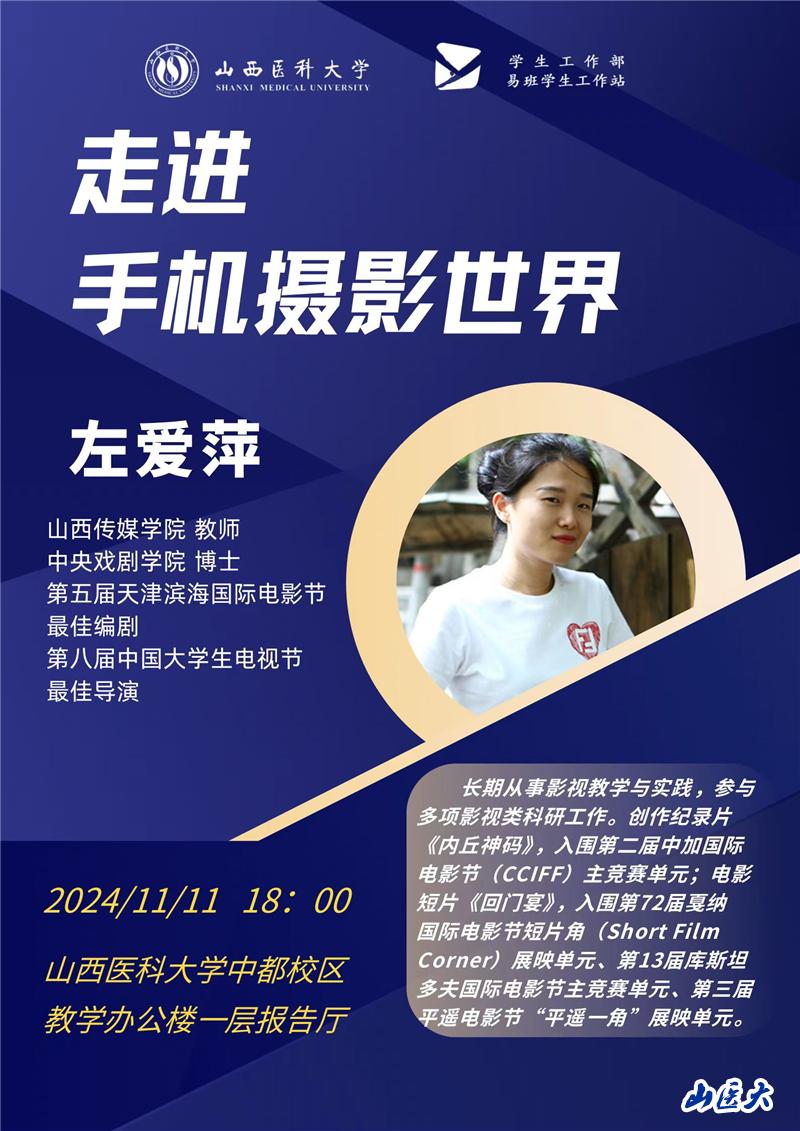 11月11日下午,学校在中都校区举办第七期“山医传习大讲堂”,主题为《走进手机摄影世界》。山西传媒学院山西电影学院教师左爱萍主讲,学生工作部副部长杨洁出席,易班学生工作站成员及手机摄影爱好学生参加,网络思政教育中心负责人王玉男主持。