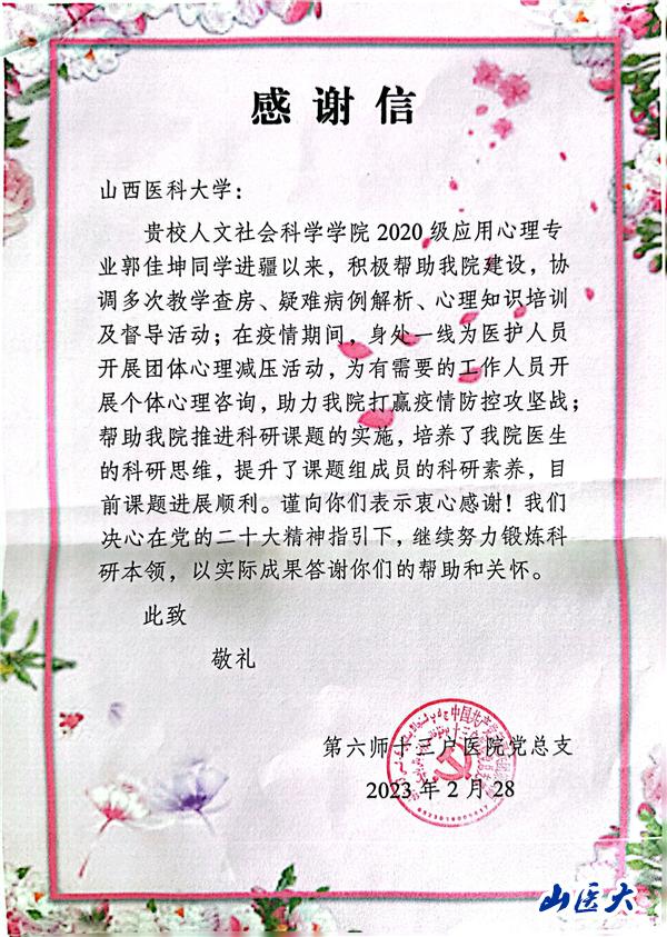 我校郭佳坤同学收到来自新疆生产建设兵团第六师十三户医院的感谢信