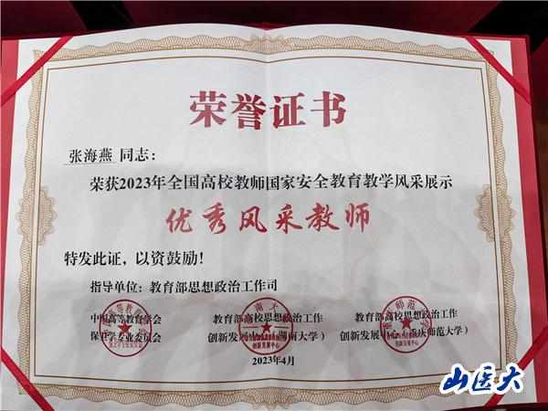 我校管理学院辅导员张海燕荣获全国高校国家安全教育教学风采展示活动“优秀风采教师”称号