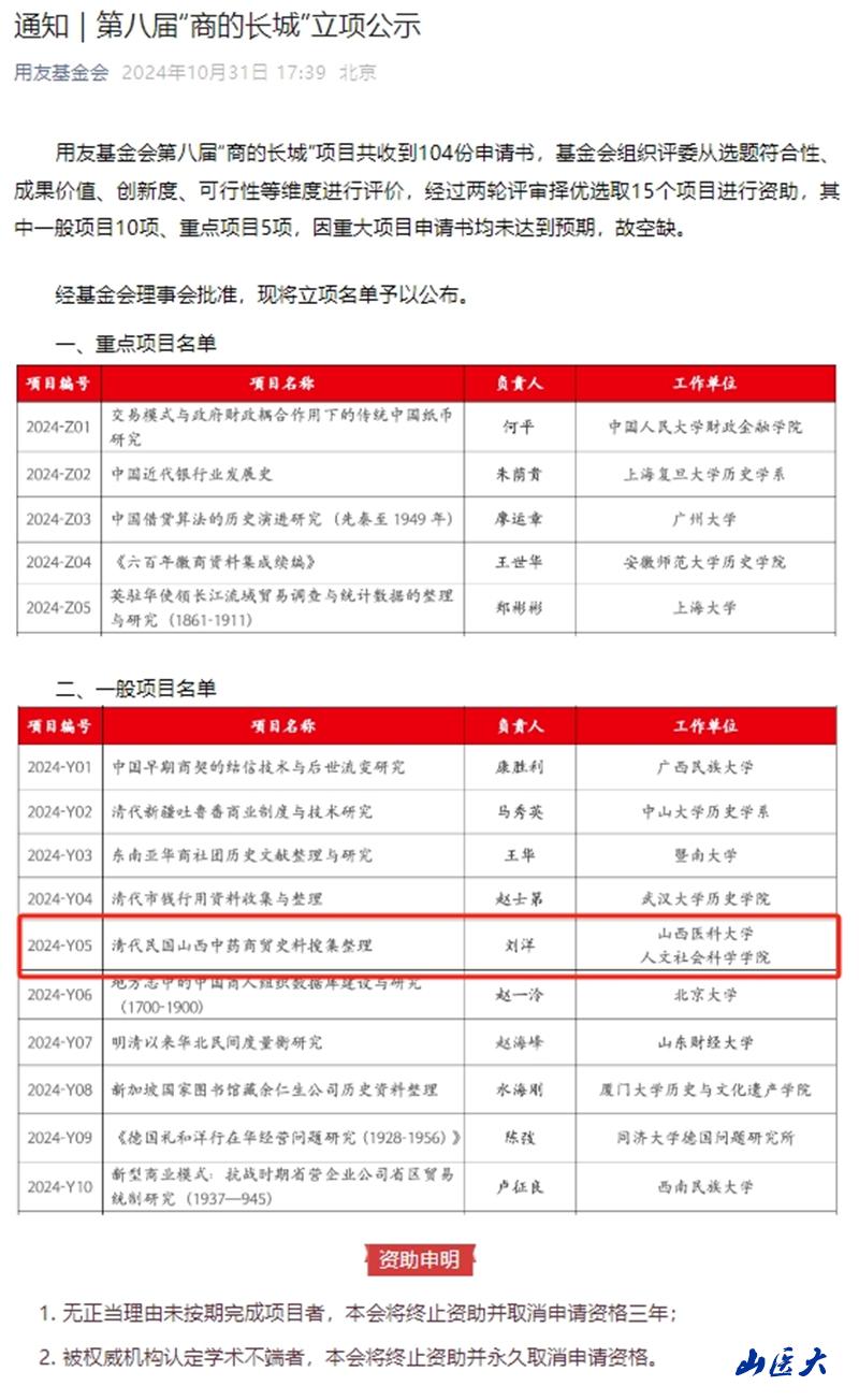 近日,第八届“商的长城”项目立项名单公布,我校人文社会科学学院刘洋教授申报的项目《清代民国山西中药商贸史料搜集整理》获批立项。这是我校首次在该人文社科类项目获得科研立项。