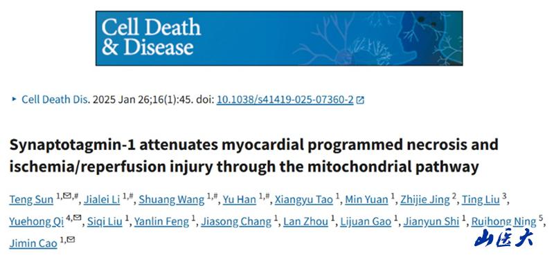 1月26日,我校细胞生理学教育部重点实验室曹济民教授团队在国际高水平期刊《Cell Death & Disease》(中国科学院一区TOP期刊,IF=8.1)在线发表了题为“Synaptotagmin-1 attenuates myocardial programmed necrosis and ischemia/reperfusion injury through the mitochondrial pathway”的研究论文(DOI: 10.1038/s41419-025-07360-2)。这项研究发现,Synaptotagmin-1(Syt1)通过线粒体途径抑制心肌细胞程序性坏死,从而有效减轻心肌缺血/再灌注(I/R)损伤。这一工作揭示了一种全新的心肌保护机制,为I/R损伤及相关心血管疾病的防治提供了新思路和潜在靶点。孙腾副教授与博士生李佳蕾、硕士生王霜及博士生韩瑜为文章的共同第一作者,曹济民教授为主通讯作者。