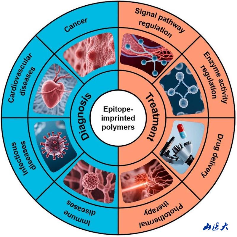 表位印迹聚合物(EIPs)是以蛋白质的一小段特征肽段作为表位替代完整蛋白进行印迹,从而确保了表位的结构特异性能够代表完整蛋白,避免了使用完整蛋白作为模板时存在的来源受限、构象不稳定等问题。近年来,EIPs在疾病诊断与治疗领域中的应用受到越来越多的关注。本论文综述了EIPs在上述领域中的最新研究进展。根据表位模板的数量和结构特征对表位印迹策略进行分类,并详细讨论了单表位印迹、双表位印迹和构象表位印迹策略。重点总结了EIPs在癌症、心血管疾病、传染病和免疫性疾病等疾病诊断中的应用,以及在调节信号通路、调控酶活性、药物靶向递送和光热治疗等治疗策略中的应用。简要探讨了EIPs在疾病诊断和治疗中面临的挑战与未来发展前景。