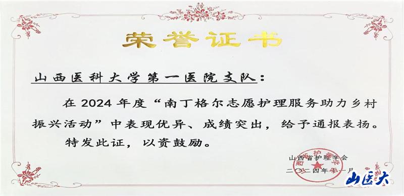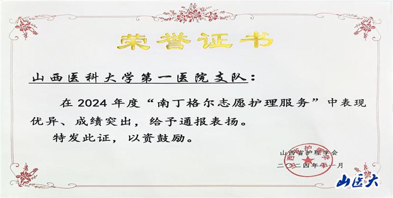 表彰大会上,山西省护理学会对第一医院南丁格尔护理支队在志愿服务领域的卓越表现给予了高度评价,并授予其“2024年度南丁格尔志愿护理服务成绩突出支队”荣誉称号。支队将以此为契机,进一步强化志愿服务意识,提升志愿服务质量,拓展志愿服务的深度和广度,为保障群众生命健康贡献更大力量。