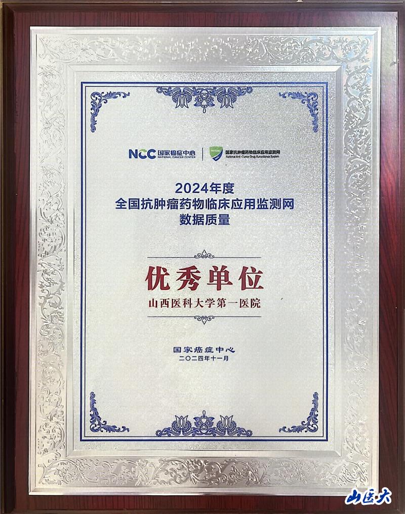 第一医院获评2024年度全国抗肿瘤药物临床应用监测网数据质量优秀单位