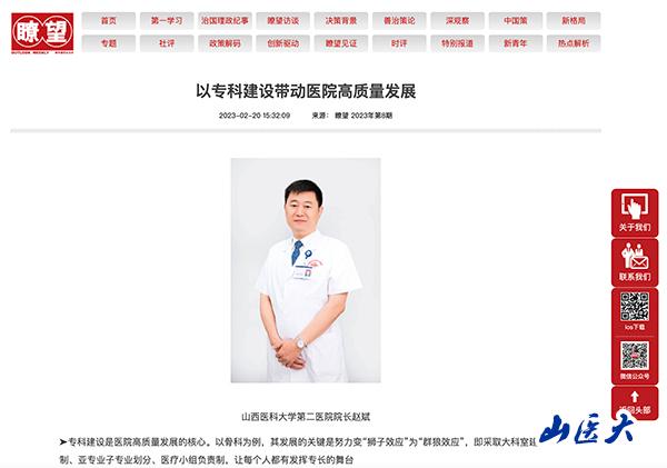 赵斌:就山医大二院来说,目前可以做的是,把一个或几个学科打造成全国突出学科,通过学科建设带动医院发展,提升医院影响力。