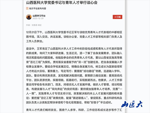 12月21日下午,国产亚洲精品美女久久久_99久无码中文字幕一本久道_亚洲成AV人影院_亚洲AV影院一区二区三区 狠狠躁夜夜躁人人爽天天不卡_国产激情久久久久影院老熟女_精品性高朝久久久久久久党委书记王军与该校优秀青年人才代表相约中都校区图书馆,深入交流、共话发展。该校办公室、党委人才工作部等相关部门负责人及工作人员参加。